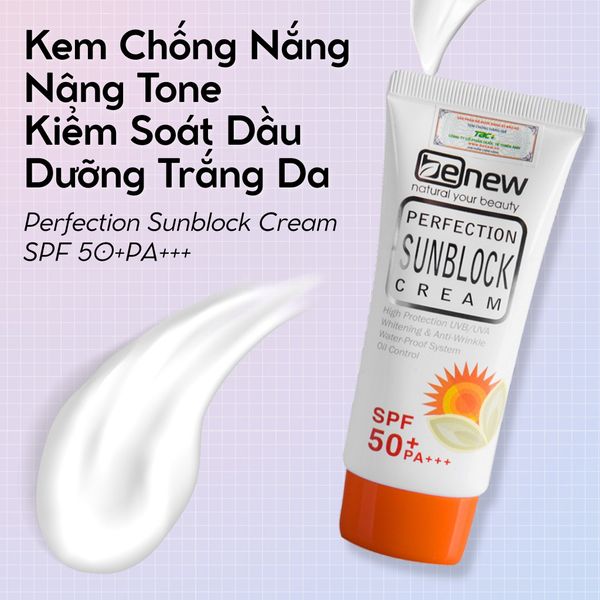 Benew Perfection Sunblock Cream SPF50+ PA+++ với chỉ số SPF50+ PA+++ giúp bảo vệ da hiệu quả trước tia UVA – UVB, hạn chế tình trạng sạm nám và cháy nắng khi hoạt động ngoài trời.
