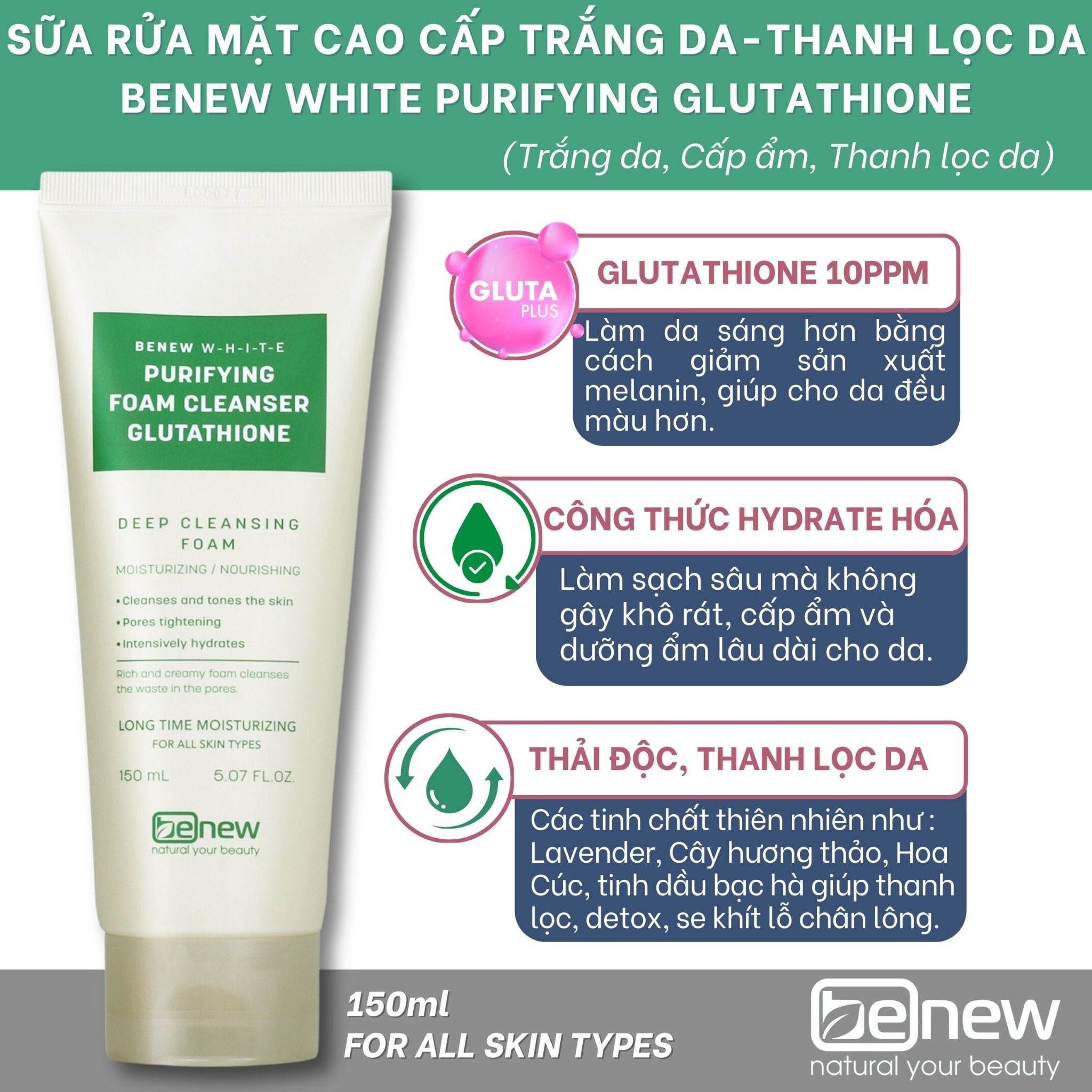 SỮA RỬA MẶT CAO CẤP TRẮNG DA, SẠCH SÂU - BENEW WHITE PURIFYING GLUTATHIONE